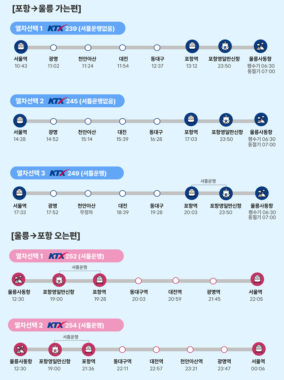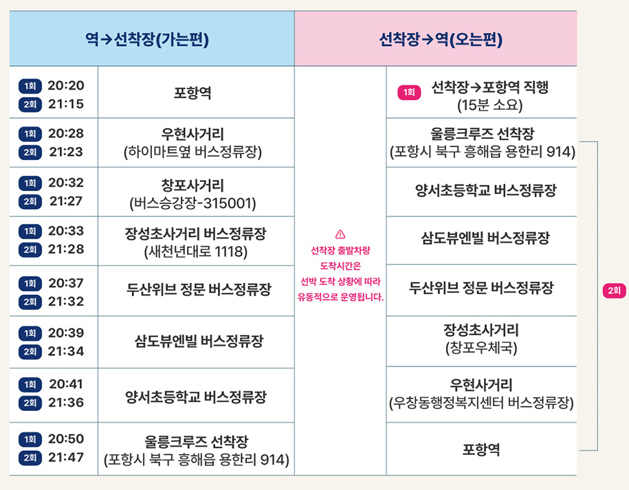 - 기상에 따라 운행시간이 다소 지연될 수 있으니 출발 전 운행시간을 한번 더 확인하세요.