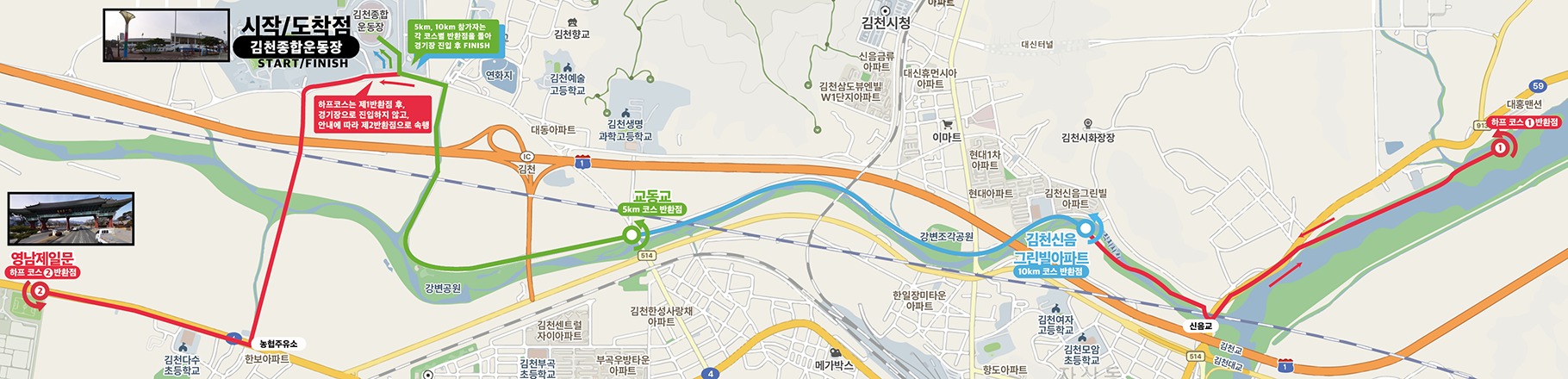 - 참가비: 하프/10km 35,000원, 5km 20,000원 (김천시민 10,000원)