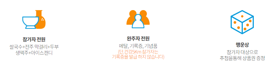 | 5km코스(남·여) | 15,000원 | -1위: 상장, 트로피 및 5만원 -2위: 상장, 트로피 및 4만원 -3위: 상장, 트로피 및 3만원 -4위~12위: 상장 및 부상 |