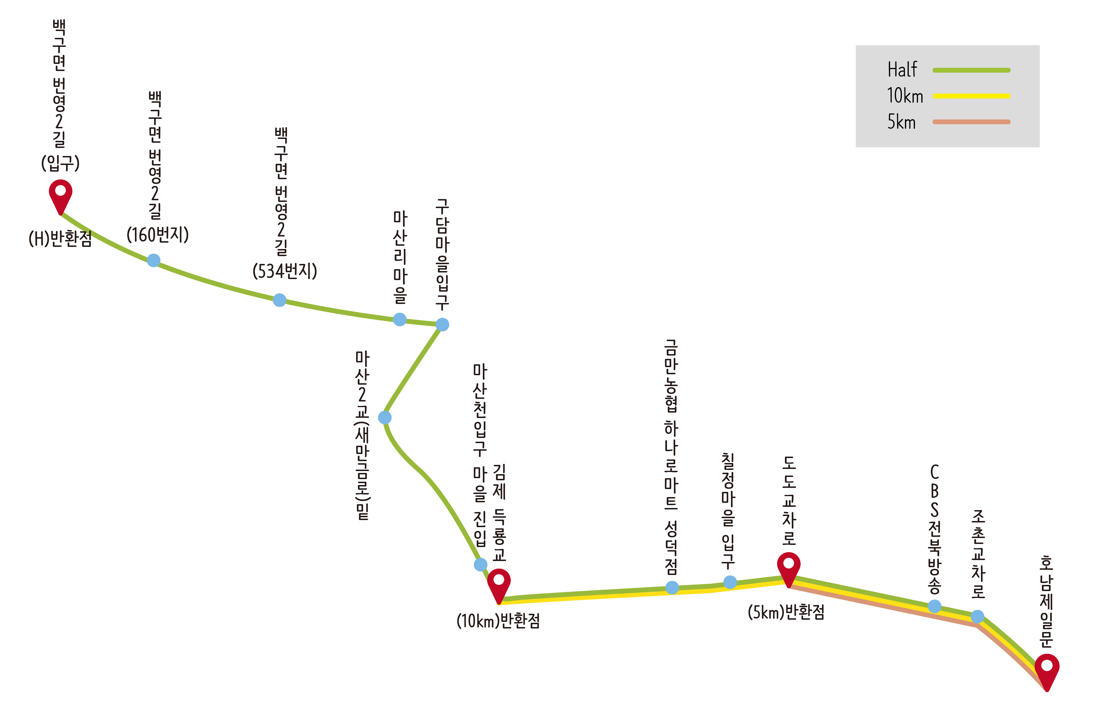1. 호남제일문 출발 ▶ 2.조촌교차로 ▶ 3.CBS전국방송 > ▶ 4.도도교차로(5km반환점) ▶ 5.칠정마을입구 ▶ 6.금만 농협하나로마트 성덕점 ▶ 7.김제득룡교(10km 반환점) ▶ 8. 마산천입구 마을 진입 ▶ 9.마산2교(새마금로) 밑 ▶ 10.구담마을 입구 ▶ 11.마산리마을 ▶ 12.백구면 번영2길 534번지 ▶ 13.백구면 번영2길 160번지 ▶ 14.백구면 번영2길(입구)