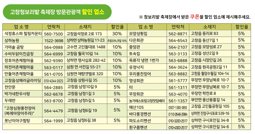 축제기간동안 고창군대 자발적으로 참여한 업체들이 관광객들에게 5~10% 할인쿠폰을 지급합니다.
