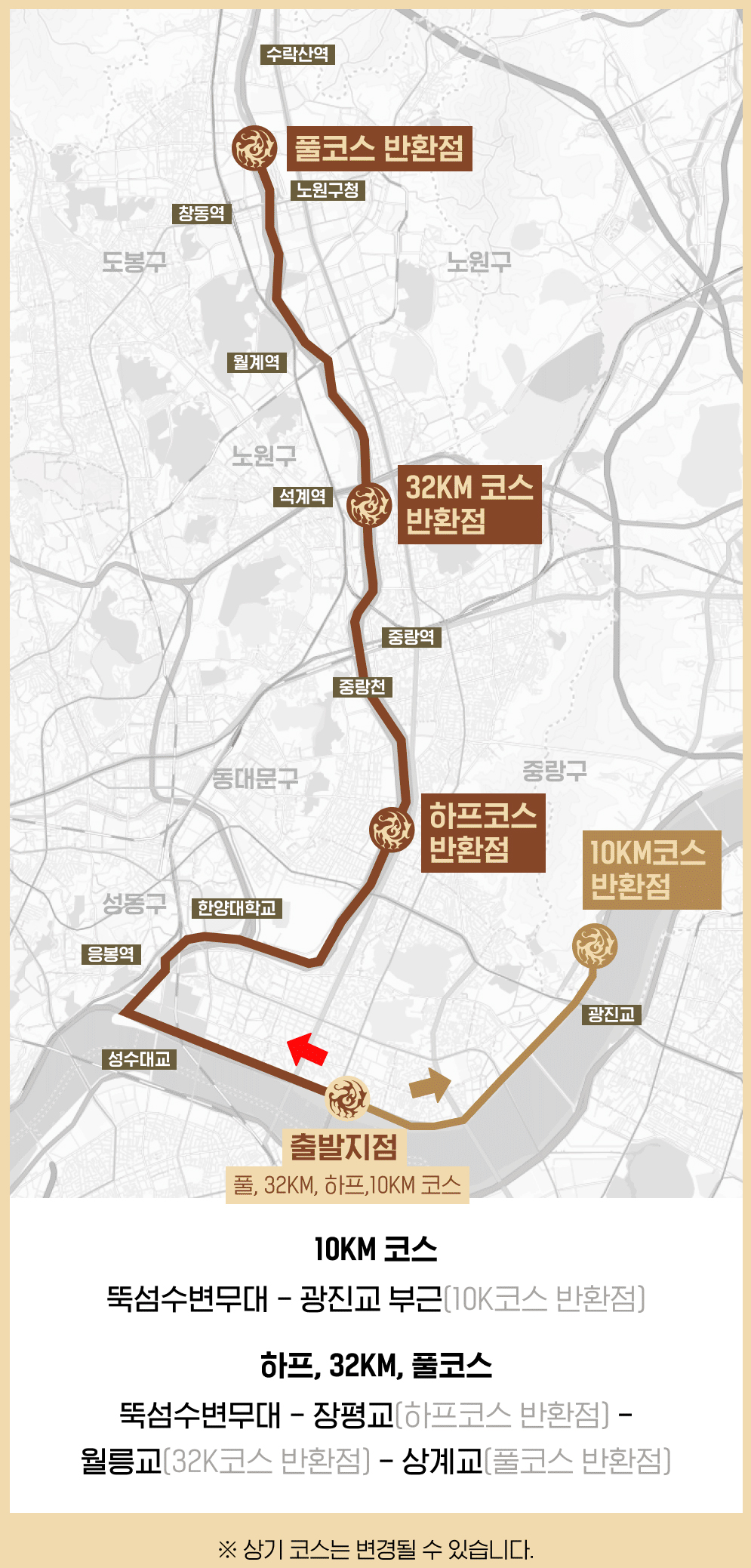 - 풀코스: 뚝섬수변무대 - 상계교(반환점) (진정한 마라토너의 자격을 증명하는 풀코스! 🏆) 꾸준한 훈련과 철저한 준비가 필수! 자신의 한계를 시험해보고 싶다면 주저 말고 도전하세요! 🔥