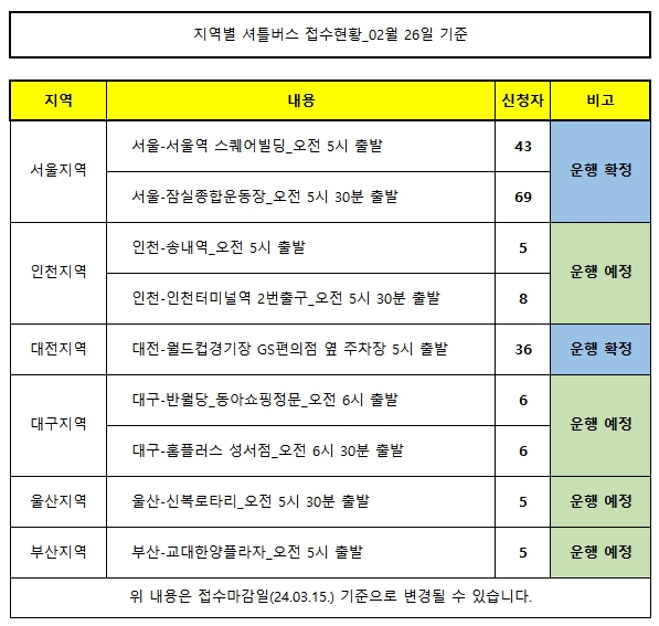위 표는 2월 26일 기준으로 운행안내이며, 공지사항을 참고하셔서 신청하시면 좋을것 같습니다.