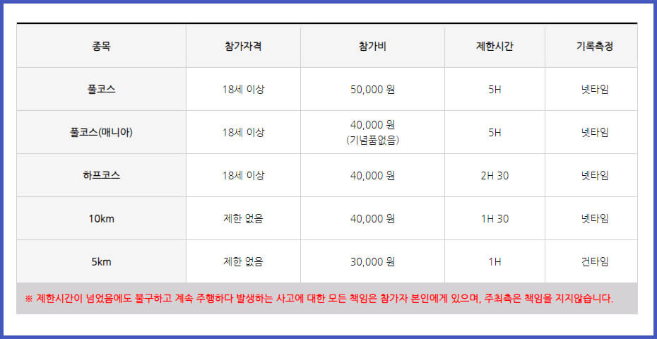 경기마라톤대회는 풀코스부터 5km 까지 총 5개 종목으로 이루어집니다.